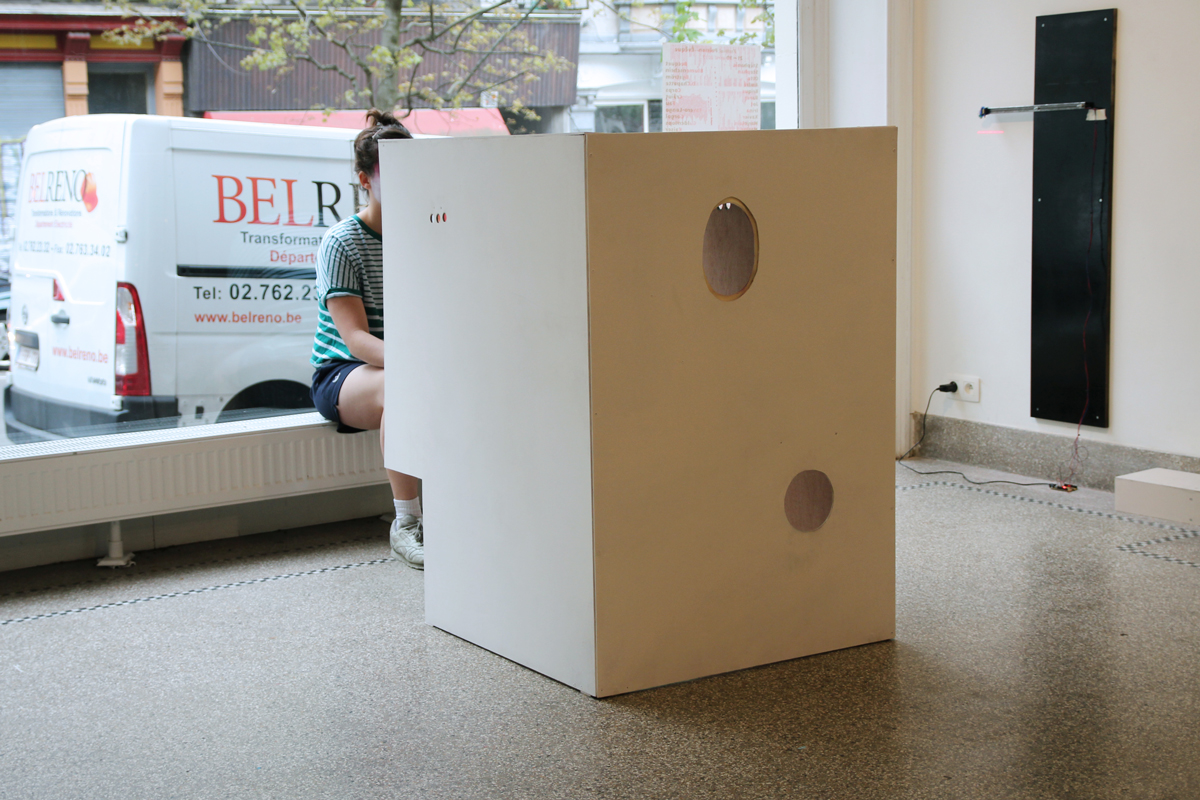 vidéo: 4’15 – 16/9 – projection en boucle – son en boucle sortant du vidéoprojecteur installation: bois contreplaqué – tasseaux de bois – vidéo-projecteur – dvd player Exposition «PM15» des lauréats du Prix Médiatine, La Médiatine, Bruxelles Janvier 2019