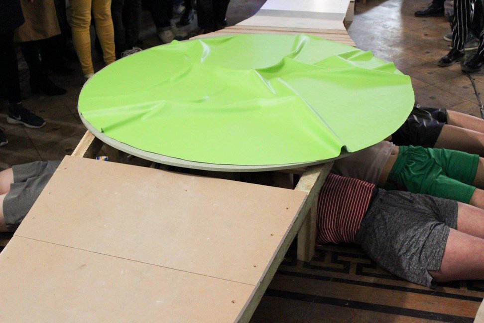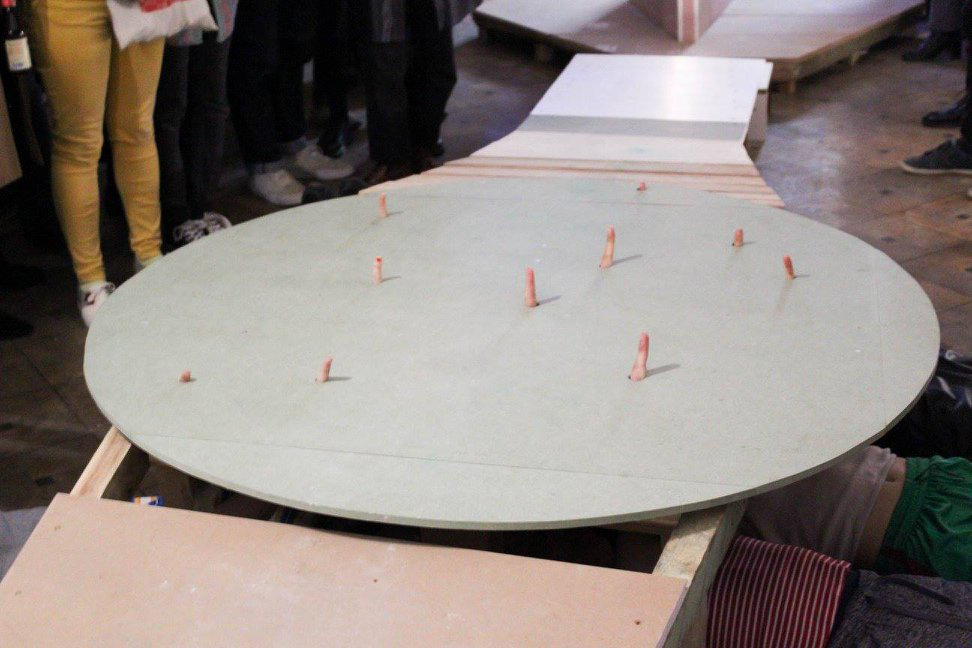The final aim of this project is to shoot a video. This video is like a map of this new utopic city, framgented and always moving by bodies supporting it.It’s projected inside an instalation where I deconstruct and use again few elements of the project’s process. The seven poeple are finally invited to a party to celebrate and share their utopy whith others particpants, weiring it on their
