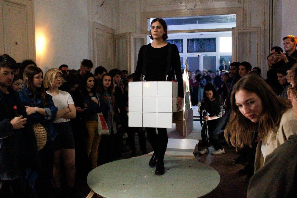 Sharing utopy est un projet né dans la ville de Lisbonne. J’ai demandé à sept personnes, de pays natales et langues différentes, d’imaginer un élément architectural utopique qui s’inscrirait dans un contexte urbain.j’ai construit ces sept utopies sous forme de maquettes que j’ai ensuite fixées sur des structures pour qu’ils puissent les porter sur leur tête. Puis j’ai invité les participants à célébrer la création fictive de cette ville idéale en portant leur utopie sur leur tête, le temps d’une fête. Une ville faite du rassemblement d’utopies partagées.