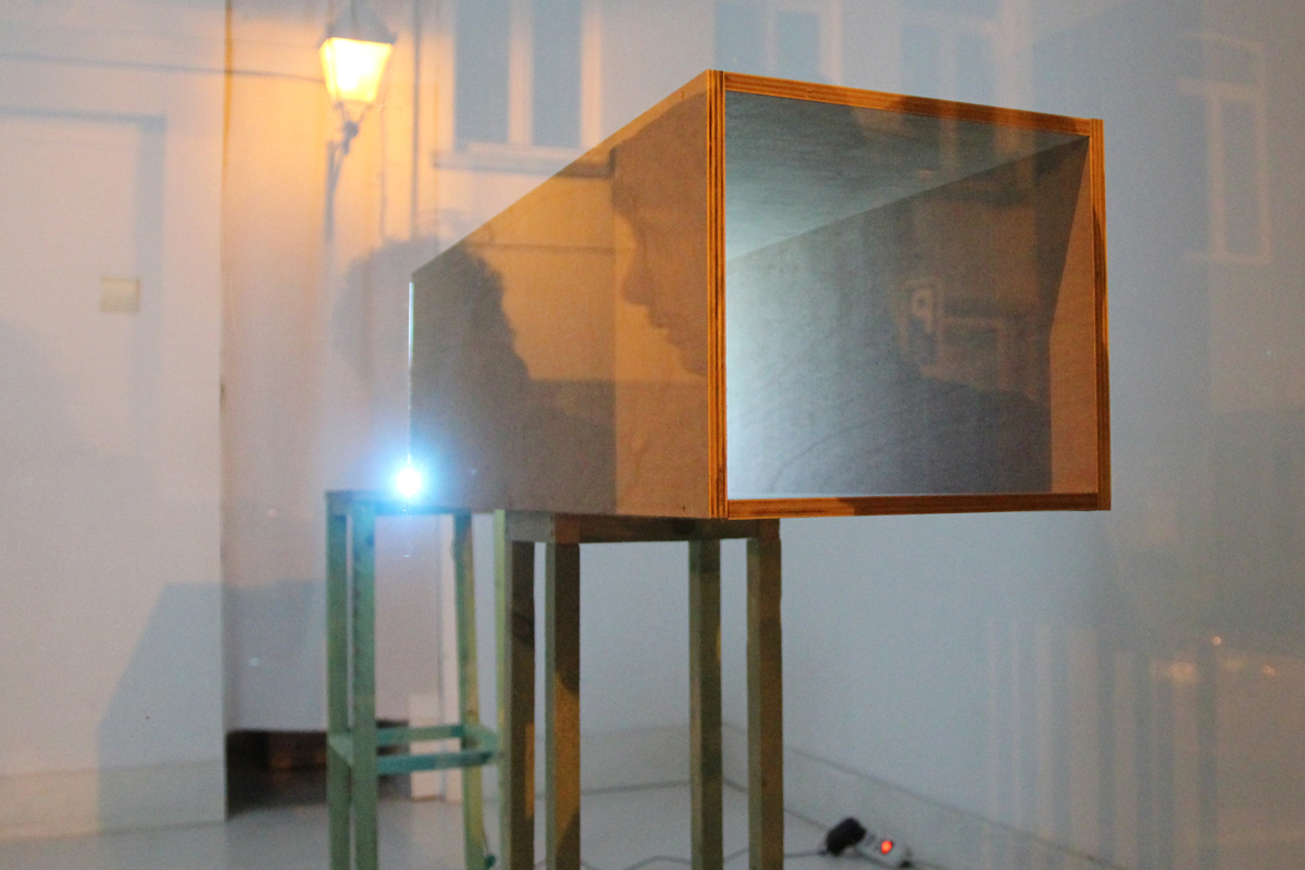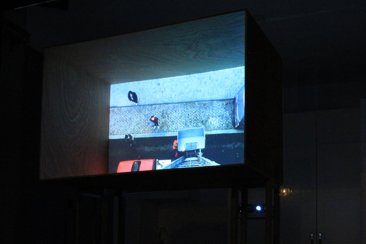 vidéo: 4’15 – 16/9 – projection en boucle – son en boucle sortant du vidéoprojecteur installation: bois contreplaqué – tasseaux de bois – vidéo-projecteur – dvd player Exposition «PM15» des lauréats du Prix Médiatine, La Médiatine, Bruxelles Janvier 2019