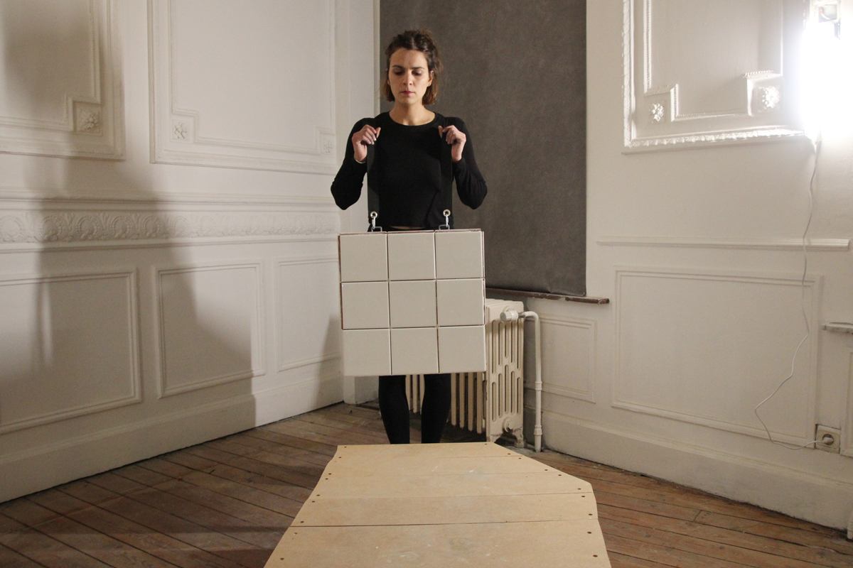 vidéo – 10’06, 16/9, full HD, son, couleur installation – 150cx150cm, tasseaux de bois, maquettes en carton peint vues de l’exposition collective «Art au Centre Liège#8», 7 février – 30 avril 2022 vitrine du 159 rue Feronstrée, Liège (BE) Pour l’exposition «Art au Centre Liège #8», j’ai créée un installation en deux parties communiquants, qui s’intéresse à ce passage entre la maquette et la vidéo, entre l’objet et sa prise en main. Pour cette installation la vidéo à été retravaillée, diffusée sans son, avec des sous-titres