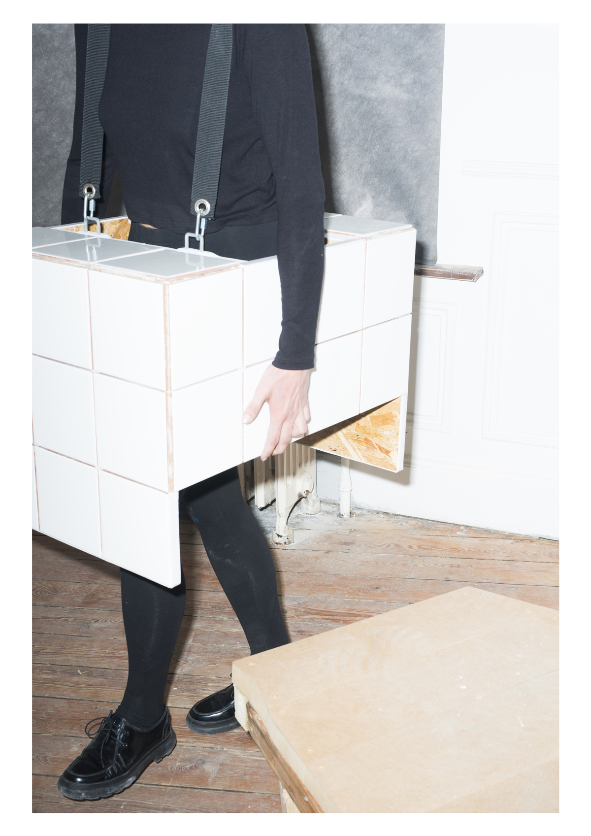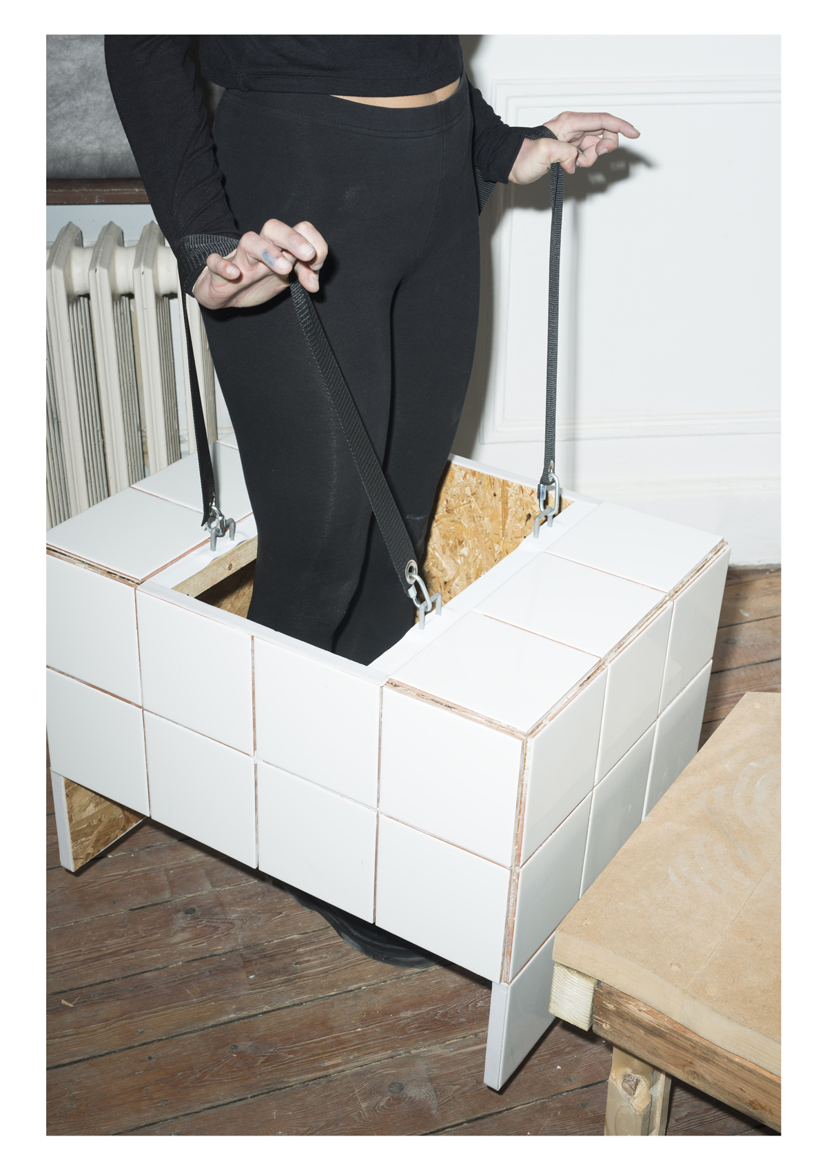 de devenir totalement objet. Il se tord, se déforme, se moule mais une tension demeure avec la matière du mobilier qu’il utilise. Il aura beau améliorer chacune de ses performances en intervenant sur lui-même ou sur cet autre corps, celui du mobilier et par extension celui de la ville, une inadaptabilité sera toujours présente. Une résistance aux rythmes mécaniques, au cadre induit par la ville.