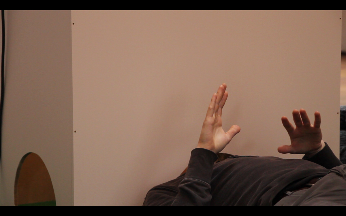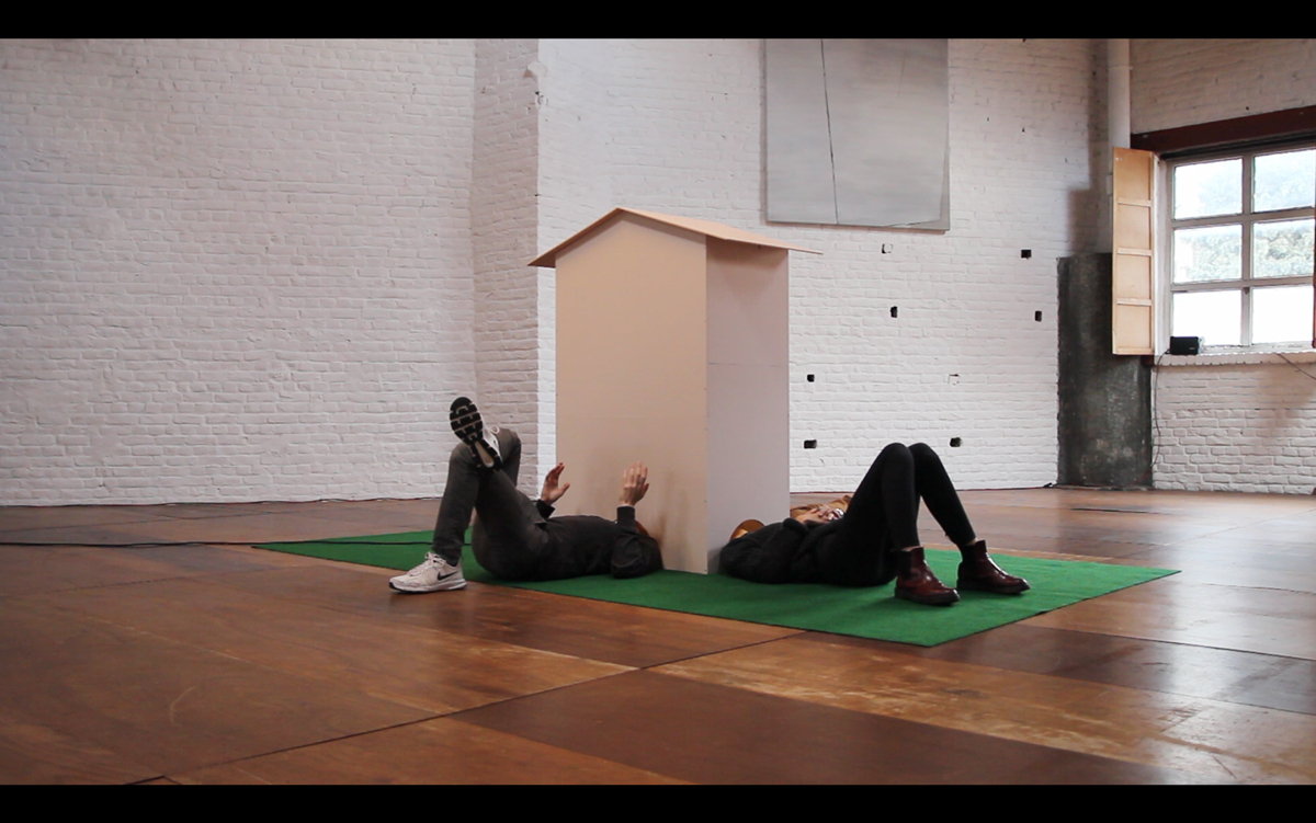 vidéo: 4’15 – 16/9 – projection en boucle – son en boucle sortant du vidéoprojecteur installation: bois contreplaqué – tasseaux de bois – vidéo-projecteur – dvd player Exposition «PM15» des lauréats du Prix Médiatine, La Médiatine, Bruxelles Janvier 2019